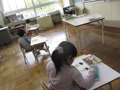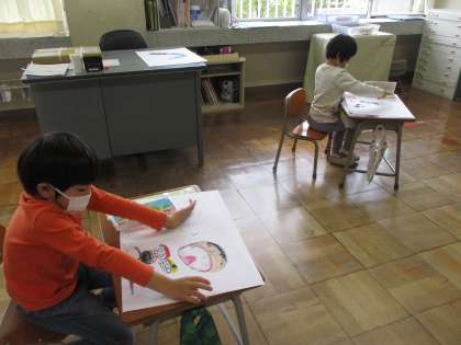 「みてみて あのね」では、楽しかったことを一人一人が思い出し、絵で表しました。先生のアドバイスを聞いて、もっとよくしようとがんばっていました。