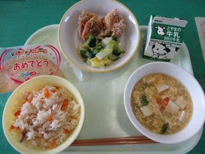 今日は「入学おめでとう集会」が行われました。給食のメニューもお祝い給食で、ちらしずし、かきたま汁、鶏肉の唐揚げ、チンゲンサイひたし、お祝いデザート(クレープ)です。とってもうれしいお祝いの一日になりました。