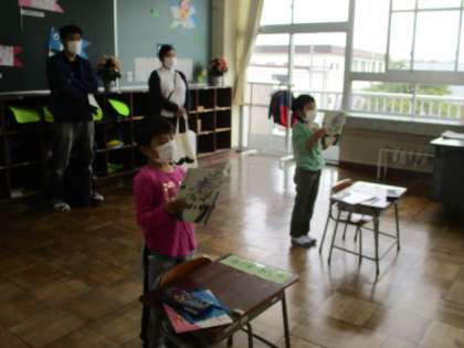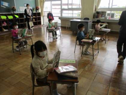1年生は口の形に気を付けて読むことを目当てに、「小さな声で」「笑顔で」「声をそろえて」など、いろいろな読み方に挑戦していました。初めての学習参観、おうちの人の前で一生懸命に読もうとがんばりました。