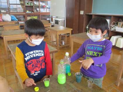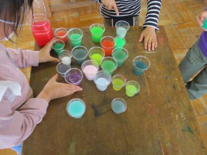 色水作りをしています。自分の持っている色と友達の色を混ぜて、きれいな色をたくさん作りました。