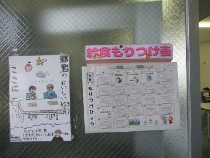 4月最後の給食は、ご飯、南蛮煮、魚のいり大豆揚げ、花野菜サラダ、牛乳でした。ランチルームの入口も、5月の盛り付け表に張り替えられました。5月も楽しみですね。