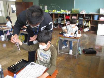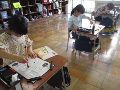今日は、筆の持ち方に気を付けながら、筆に水を含ませいろいろな腺をなぞりました。緊張しながらも、姿勢よく練習に励むことができました。