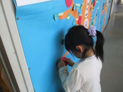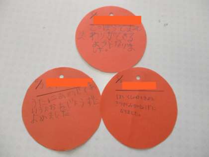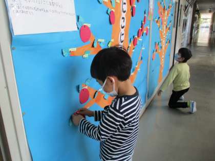 りんごの実を書きました。自分のがんばりや友達のよいところをじっくり考えていました。これからも自分のがんばりを見付けて、たくさんりんごの実を書きましょう。