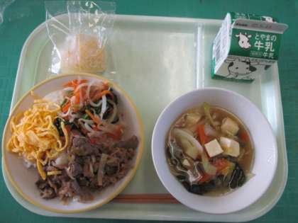 今日のメニューは、ビビンバ(焼き肉、ナムル、錦糸卵)、中華スープ、冷凍りんご、牛乳でした。ランチルームでは、みんなが大きな口を開けて、おいしそうに食べていました。