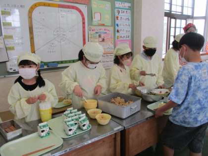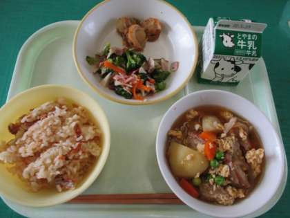 今日のメニューは、ごもくご飯、ホタテの香味焼き、ブロッコリーとエリンギのソテー、油麩の卵とじ、牛乳でした。色鮮やかなメニューで、おかわりの手もたくさんあがっていました。