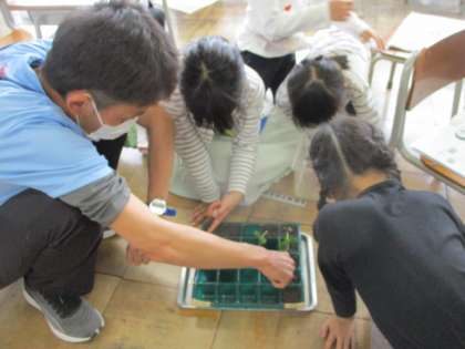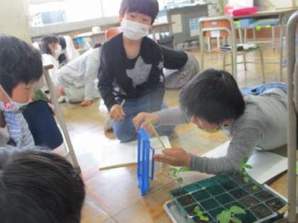 ヒマワリ、ホウセンカの芽も少しずつ育ってきています。これからもよく観察を続けていきましょう。