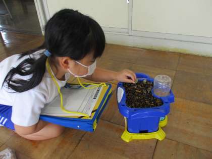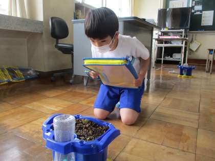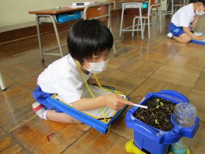 休日の間にアサガオの芽が出ていて、朝から大喜びの1年生です。生活科の時間に観察し「ハートみたいな形だね」「葉っぱが2まい重なっているよ」とたくさんの気付きがありました。