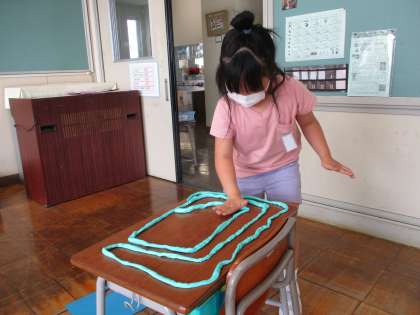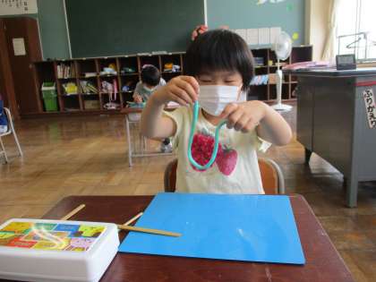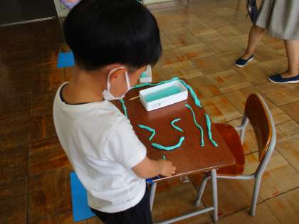 粘土で長いひもを作っています。どんどんひもが長くなって、粘土板に乗り切らなくなっていました。そして、粘土のひもがコップや顔に変身!ひもを使っていろいろなものを作りました。