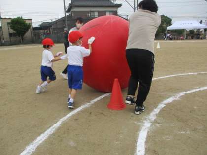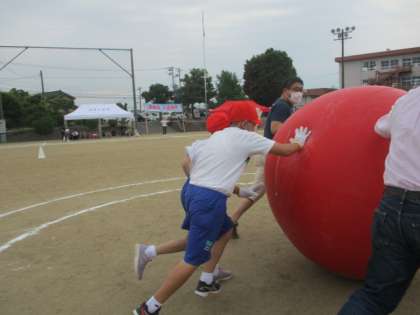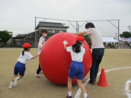 スペシャル大玉転がしでは、保護者の方々も大活躍。親子で息を合わせて転がしました。
