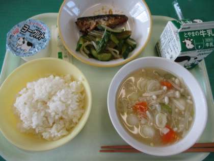今日のメニューは、ご飯、いわしのしょうが味、茎わかめサラダ、白玉汁、ヨーグルト、牛乳でした。子供たちは白玉の数を数えながら食べていたことでしょう。