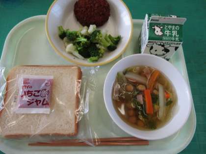 今日のメニューは、食パン、コロッケ、花野菜サラダ、ひよこ豆のスープ、いちごジャム、牛乳でした。さくさくコロッケに色鮮やかな野菜がたっぷりで、おいしかったですね。