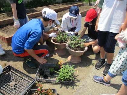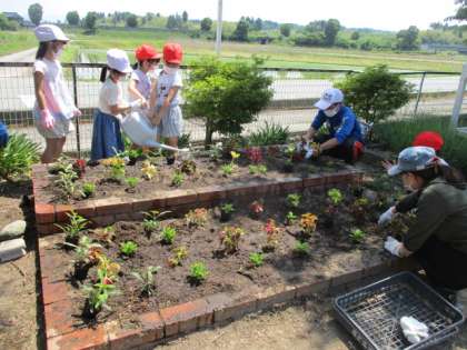 正面玄関や前庭に、きれいな花の苗を子供と職員で植えました。ぐんぐん育って、みんなの目を楽しませてくれることでしょう。みんなの手でお世話をしていきましょう。