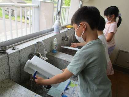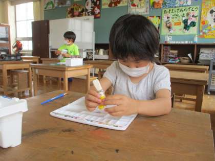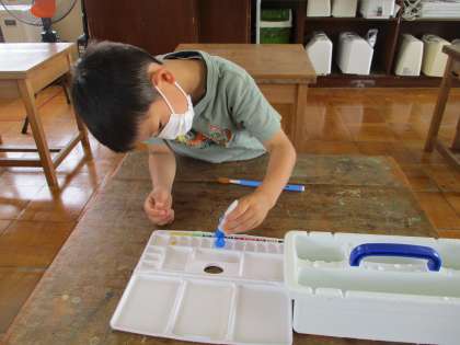 初めて絵の具を使いました。準備や片付けもしっかりできました。