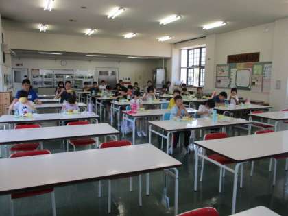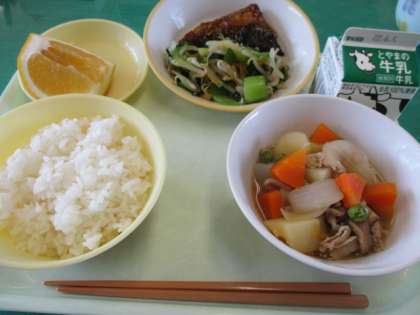 今日のメニューは、ご飯、鯖の塩焼き、香味和え、豚肉の南蛮煮、河内晩柑、牛乳でした。1、2年生は校外学習のため、ランチルームは3〜6年生だけでした。いつものメンバーがいないと、やはりさみしい感じがします。でも、きっと校外学習を満喫していることでしょう!
