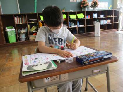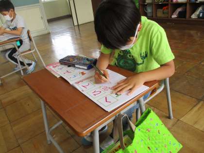 ひらがなの練習をしています。姿勢を正して、ていねいに書いていました。