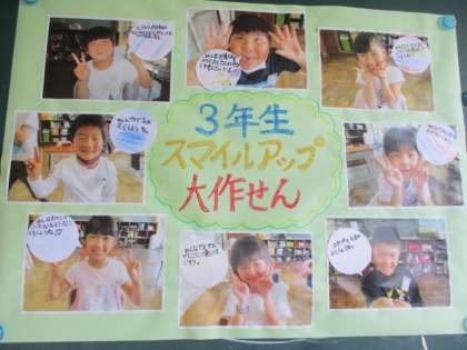教室には、今取り組んでいる「3年生スマイルアップ大さくせん」について、掲示されています。一人一人がどのような教室を目指していこうとしているのか、よく分かります。願いに向かっていることがかっこいいなと思います。実現を目指してがんばっていきましょう!
