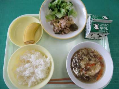 今日のメニューは、ご飯、あっさりチキン、添え野菜、卵ともずくのスープ、バナナ、牛乳でした。チキンは酢のせいか、柔らかで旨みがいつも以上に味わえました。今日は涼しい日だったので、温かいとろみのあるスープはうれしかったですね。
