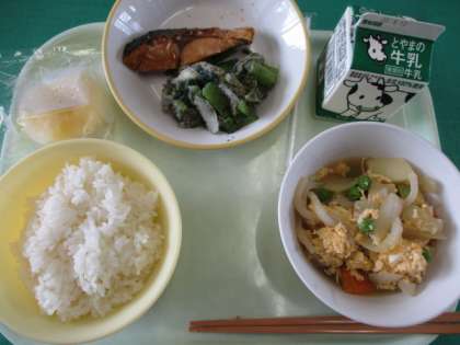 今日のメニューは、ご飯、ふくらぎの照り焼き、よごし、卵とじ、冷凍りんご、牛乳でした。卵とじの中には色鮮やかなグリンピースが入っていましたが、上手に箸でつまんで食べることはできましたか?