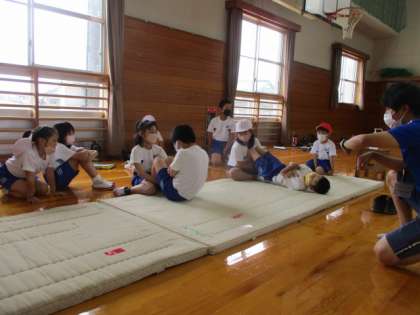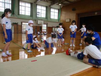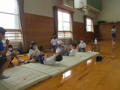 上体起こしでは、ペアになって測定します。正しいやり方も再度確かめました。自信をもって挑戦できましたね。