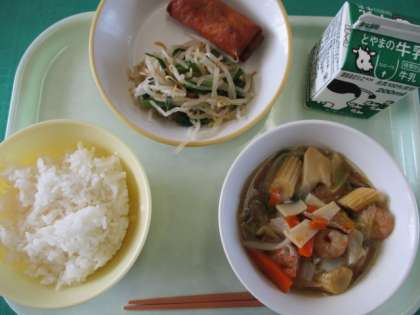 6月10日(金)今日の給食 公開日 2022/06/10 更新日 2022/06/10 池多っ子ゴーゴー 今日のメニューは、ご飯、春巻、塩ナムル、八宝菜、牛乳でした。プール清掃でたくさん働いたことで、食欲も旺盛だったことでしょう。