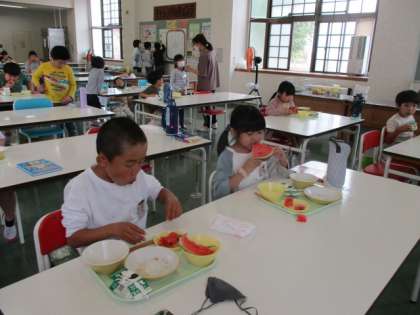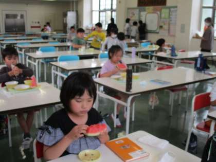 今日のメニューは、ご飯、豚肉の塩麹いため、キュウリもみ、味噌汁、スイカ、牛乳でした。給食の最後のお楽しみは、デザートのスイカです。スイカはとても甘くて、おいしそうに頬張る姿があちらこちらで見られました。