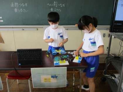 モーターを回転させようと回路をつくっています。友達や先生に聞いたり、相談したりしながら、学習を進めています。分かったことや考えたこともカードにまとめることができましたね。