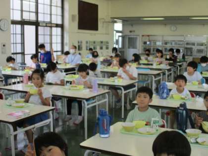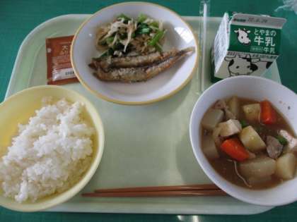 今日のメニューは、ご飯、ししゃもの唐揚げ、はりはり和え、鶏肉とじゃがいものごま煮、大豆ふりかけ、牛乳で、かみかみ献立でした。ししゃもがからっと揚がっていて、調理員さんの技が光っています。頭から尾までとてもおいしく食べることができました。今週も給食をみんなで味わっていただくことができました。