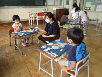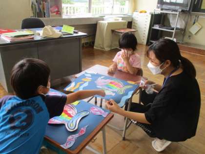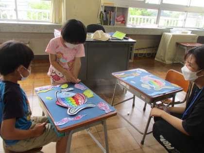 友達から褒められ、うれしそうです。一人一人が頑張って仕上げた作品です。学習参観に掲示しますので、どうぞご覧ください。