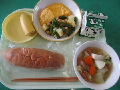 今日のメニューは、ココアコッペパン、チーズオムレツ、ひよこまめのオリーブオイル炒め、ポトフ、バナナ、牛乳でした。野菜に味がしみていて、とてもおいしかったです。