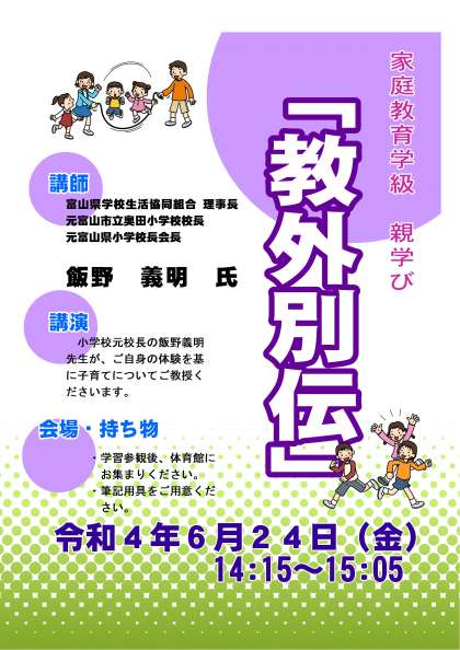 なお、家庭教育学級は熱中症予防のため、体育館から2階視聴覚室に変更させていただきます。涼しい部屋でのご講演といたします。よろしくお願いいたします。