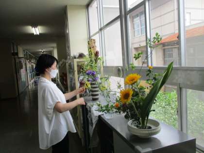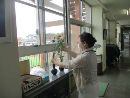 来校される方々のため、環境を整えています。美しい花が生けられています。通る度に立ち止まるくらい、素敵な花々です。心が和みます。