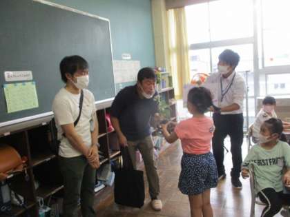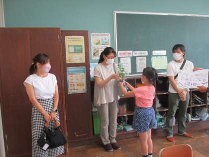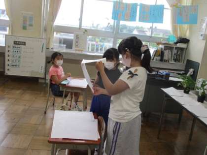 まちのすてきをまとめ、発表しています。参観されている保護者の方に、ハーブの香りを確かめていただく場面がありました。