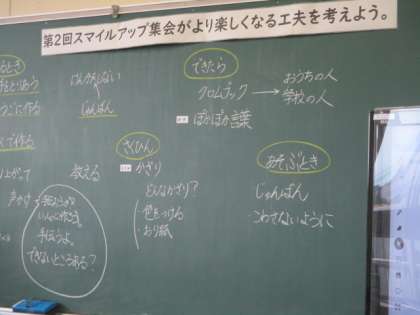 スマイルアップ集会に向けて、話合いを積み重ねています。仲間の話にしっかり耳を傾けながら、みんなでよい集会をつくろうとしています。