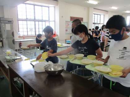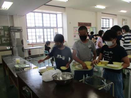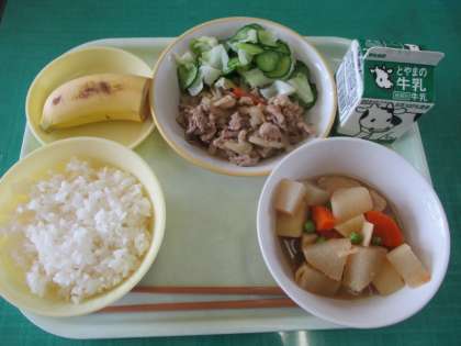 今日のメニューは、ご飯、豚肉のジャンロー、刻み和え、炊き合わせ、バナナ、牛乳でした。暑さに負けないようにもりもり食べた後は、しっかりと片付けています。