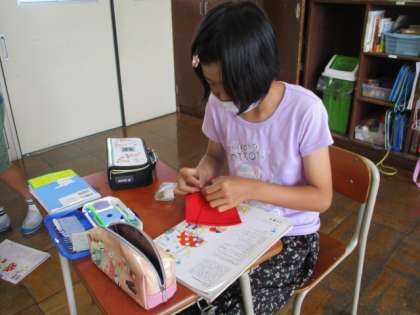 細かな縫い目を確認しながら、納得のいくよう頑張っていました。友達と見せ合いながら、今度の目当ても新たにしています。