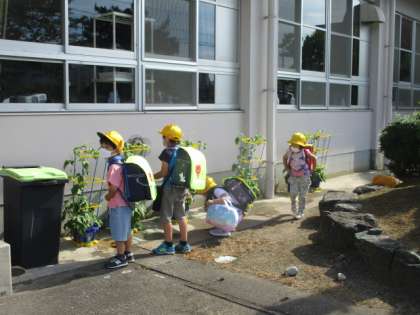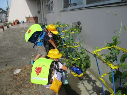 1年生が登校して真っ先に向かうのは、アサガオの鉢です。水道の蛇口まで何度も行ったり来たりして、たっぷりと水をやっています。「がんばれ!」という声が聞こえてきました。明日、咲きそうなつぼみも見つかりました。明日が待ち遠しいですね。