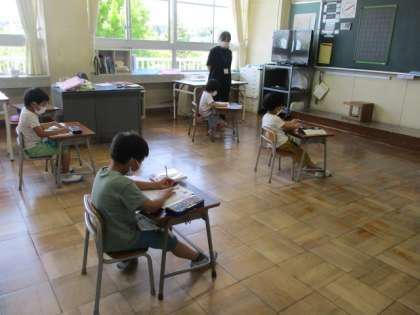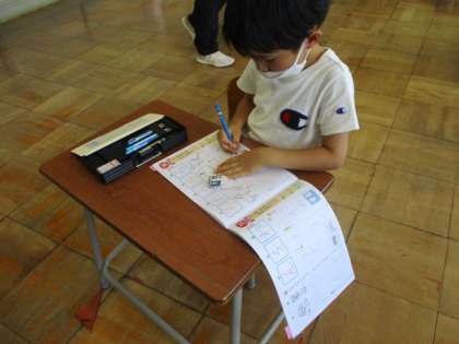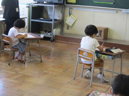ひらがなの練習をしています。正しい書き順で書こうと、声を出して確かめています。上手に書けるようになってきましたね。