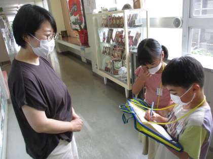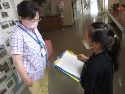 2年生がインタビューに挑戦しました。「好きな食べ物」「好きな教科」「池多小学校のすてきなところ」を先生や職員のみなさんに聞いていました。聞きながら、頑張ってメモをとっています。