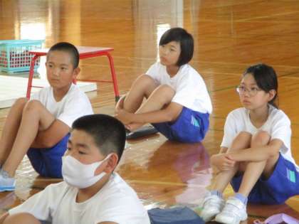 走り幅跳びのポイントについて、先生の話を聞きながらイメージしています。真剣に聞く態度が素敵でした。ぜひ、次回の運動につなげていきましょう。