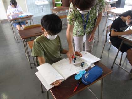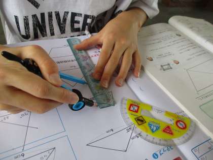 コンパスや分度器、三角定規等を使って合同な形を書いています。