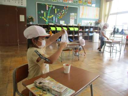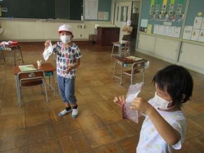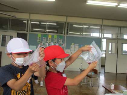 咲き終わったアサガオの花を使って色水作りをしました。「しっかりつぶすと色が濃くなるよ」と教え合っていました。