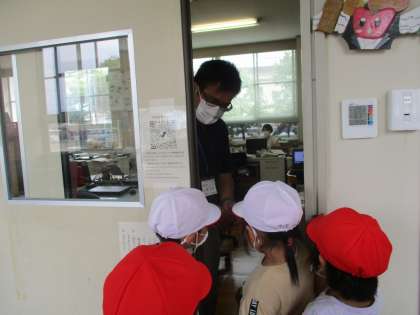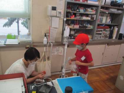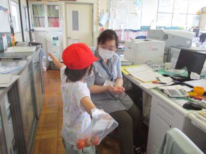 収穫したトマトを職員室の先生にプレゼントしました。喜んでもらって、とても満足そうな子供たちでした。