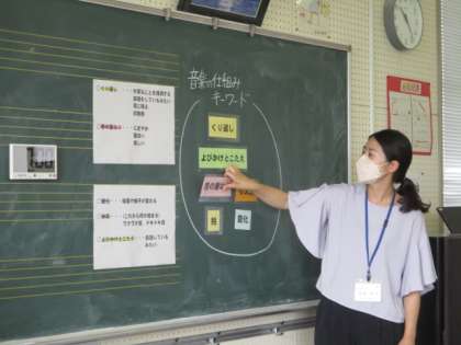 「いろいろなリズムを感じ取ろう−言葉でリズムアンサンブル−」の学習に取り組んでいます。「繰り返し」「変化」等、音楽の仕組みを考えながら取り入れています。