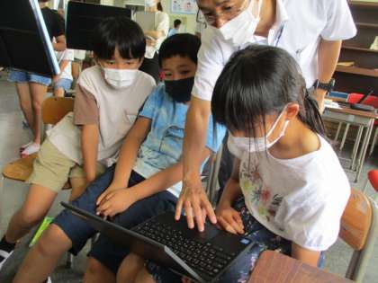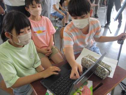 まずは、前の時間に撮影した演奏の動画を見ました。自分たち、仲間の演奏からよさを感じ取っています。