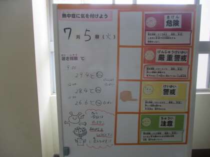 7月5日(火)熱中症情報 公開日 2022/07/05 更新日 2022/07/05 池多っ子ゴーゴー 保健室前に大きなボードを設置しています。一人一人が気温等を確認し、安全に活動できるよう役立てています。