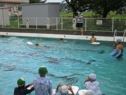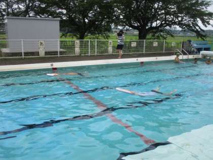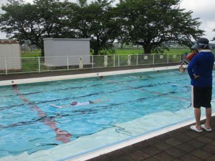 大きな動きを心がけ、ゆったりと進んでいく高学年。ときに友達の泳ぎ方を参考にしながら、一人一人が泳ぐ力を付けようと、練習に励んでいます。