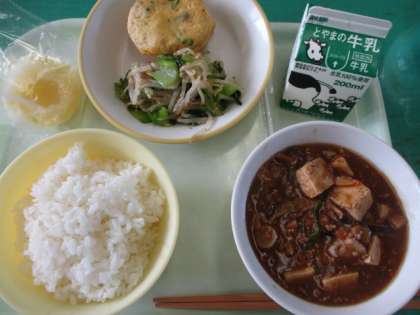 今日のメニューは、ご飯、麻婆豆腐、かに玉、ナムル、冷凍りんご、牛乳でした。りんごはとてもひんやりとしていて、体を冷やしてくれましたね。