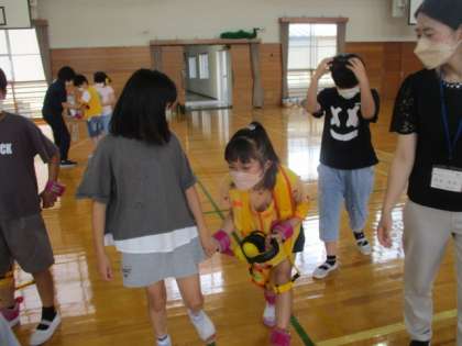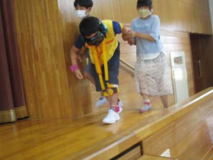 高齢者の方の体験を行いました。様々な装具を付けて歩いてみたところ、「自由が奪われた」という言葉をつぶやく子供がいました。体験したことをみんなで交流し、考えを深めていきましょう。