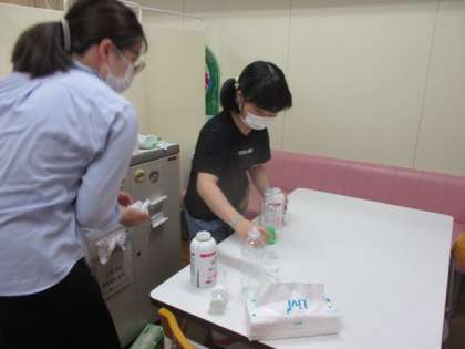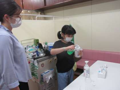 みんなのために、石けん液を補充しています。手洗い習慣が身に付いているため、石けん液の補充は欠かせません。