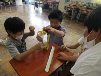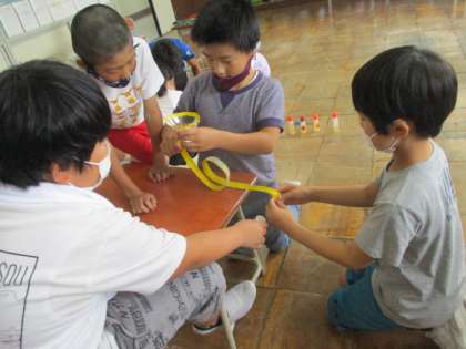 「第2回スマイルアップ集会」を進めています。アイディアいっぱいのおもしろい工作をつくっていました。